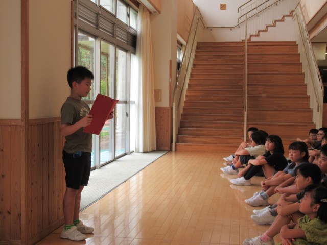 9月6日(土)実施予定の保小中合同運動会に向け、みんなと協力して取り組むこと、80メートル走を全力で走り切ることを目当てに頑張る思いを伝えました。会場にいたみんなが集中して聴いていました。