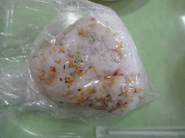 ビニール袋にご飯とふりかけを入れて、おにぎりにしていただきました。非常時に、炊き出しで、温かい味噌汁とおにぎりが食べられたら、心がちょっと元気になりそうです。