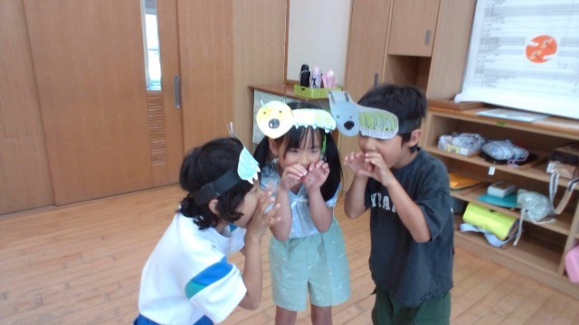 「やくそく」というお話に出てくるあおむしの動きや気持ちを考えるために、登場人物のお面をつくりました。次回、役になりきって動いてみたり、気持ちを考えたりしてみます。