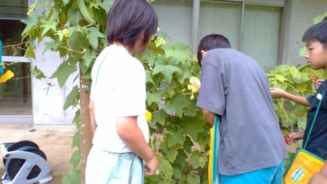 理科「花から実へ」では、ヘチマの花とアサガオの花を観察しました。おしべとめしべが別々になっているヘチマの花と、一緒になっているアサガオの花のつくりの違いを見付けました。