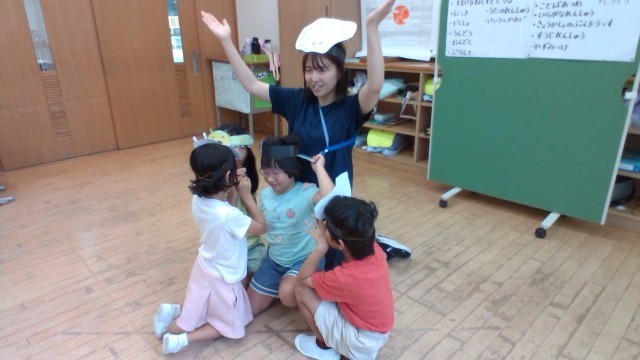 今日は、お面をつけて登場人物になりきりました。気持ちを声の大きさ、表情、動きでうまく表しています。