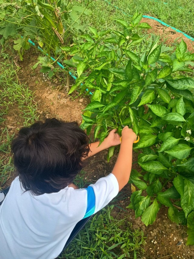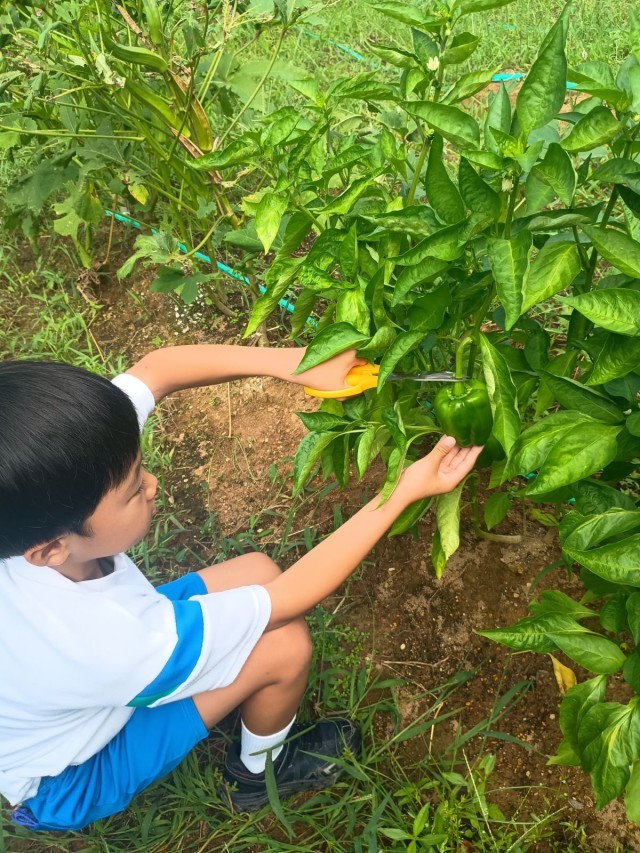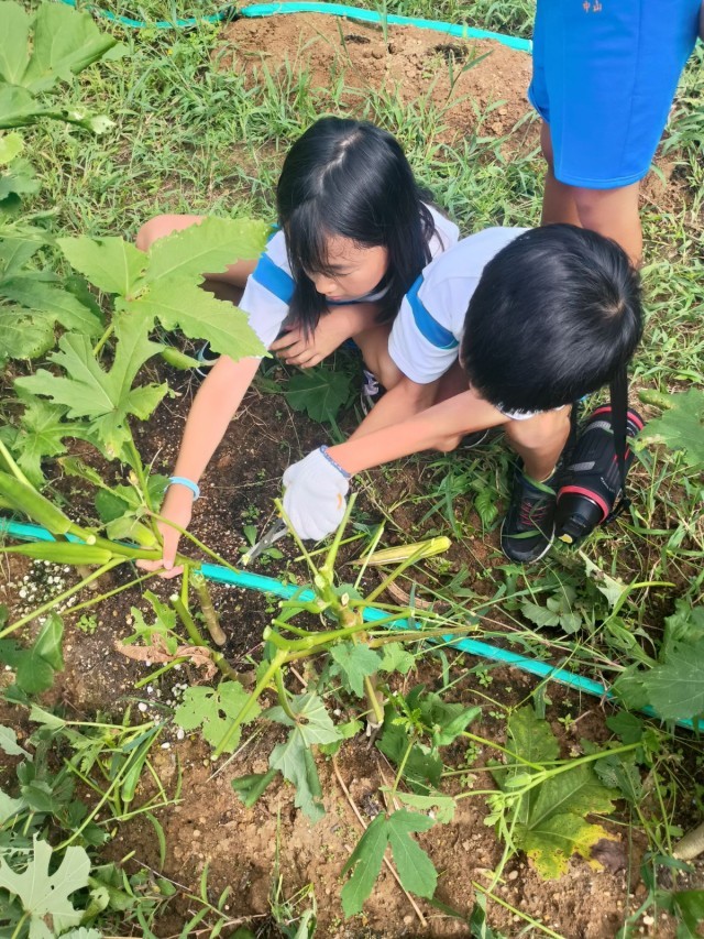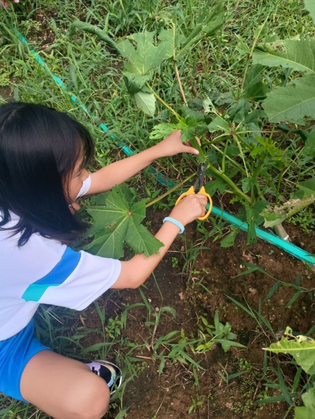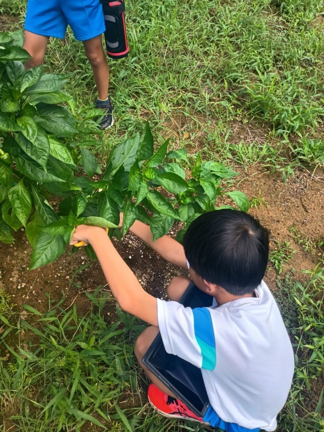 オクラやピーマンの実がなりました。3年生みんなで収穫して観察しました。