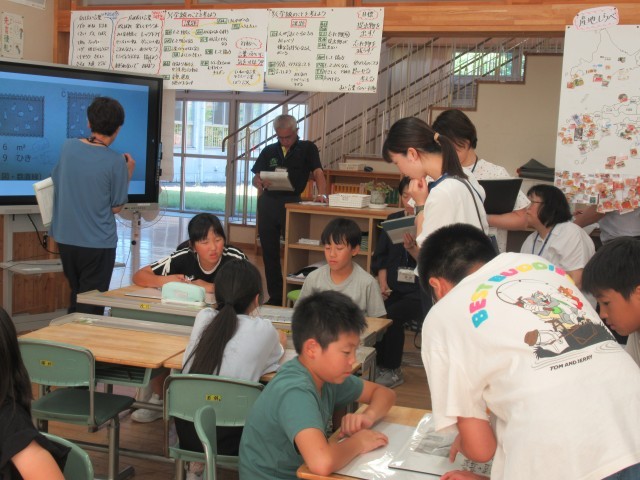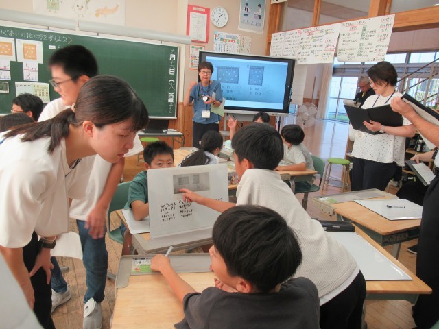 16日(火)5限、小中学校の教員が5年生の算数科「比べ方を考えよう 単位量あたりの大きさ」の授業を参観し、研修を深めました。