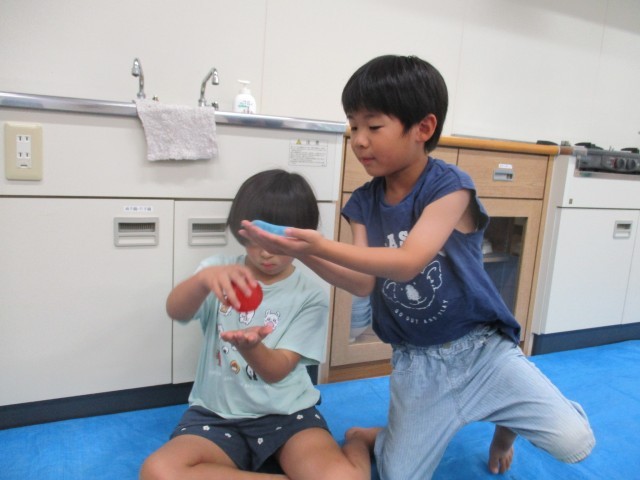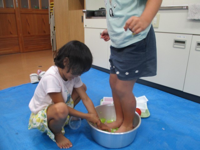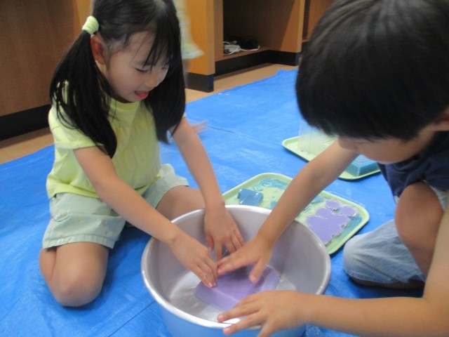 生活科で夏らしい遊びを計画し、寒天遊びをすることにしました。材料や必要な用具を自分たちで調べ、準備しました。2日前に作った寒天が固まっていて、子供たちは大興奮!寒天をぐしゃりと潰したり、足で踏んでみたり、、、、寒天のプルプルとした感触を楽しんでいました。