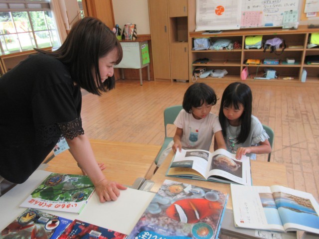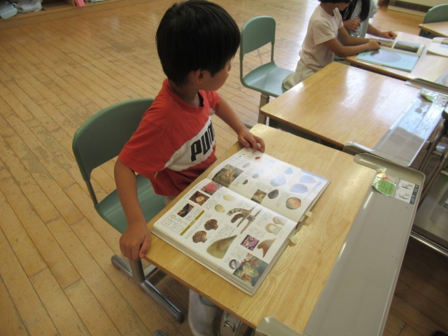 1年生の教室では、「うみのかくれんぼ」の学習でしょうか、子供たちは、海の生き物についての図鑑を楽しそうに眺めていました。
