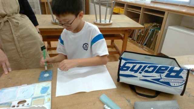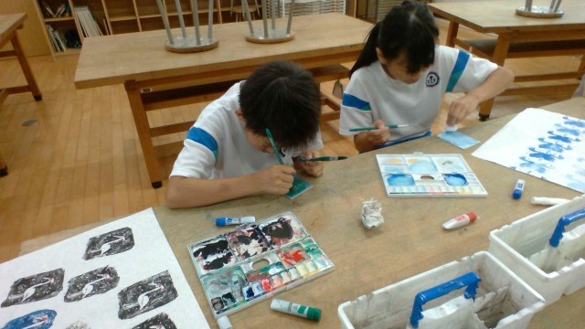 自分がもように表したいものを消しゴムに彫って、和紙に本刷りしました。
