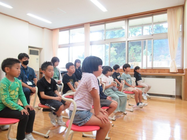 国語科の教科書掲載の1年生「くじらぐも」、2年生「スイミー」から始まりました。鈴木優子先生の朗読とともに効果音が流れ、臨場感が高まっていきます。目を閉じれば作品世界に入り込んでいるよう…。子供たちは、美しい言葉のシャワーを浴び、言葉の響きを味わい、表現のすばらしさを感じ取りながら聴き入っていました。