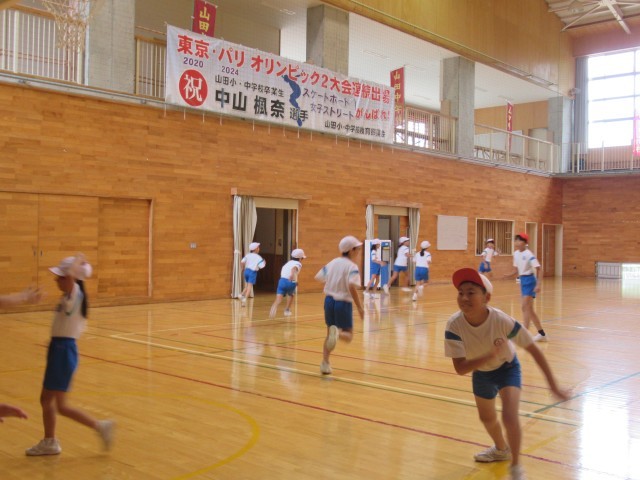 全校児童みんなが体育館に集まり、元気いっぱい走り回っていました。子供たちは、楽しそうでした。振り返りでは、捕まってしまったことを悔しがったり残念がったりする意見が多く聞かれました。子供たちは「ケイドロ集会」の2回目を楽しみにしているようでした。