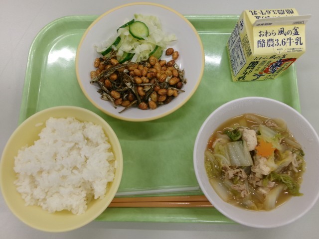 今日のメニューは、〇小魚入りフライビーンズ〇きざみあえ〇白菜なべ〇牛乳〇ごはんです。