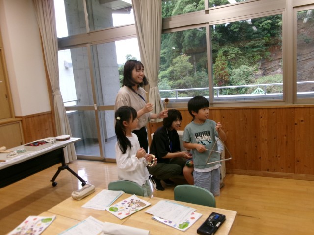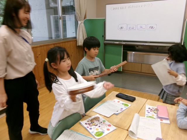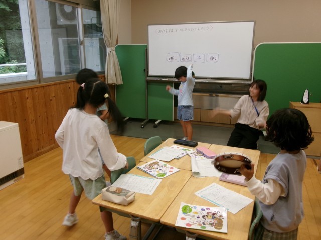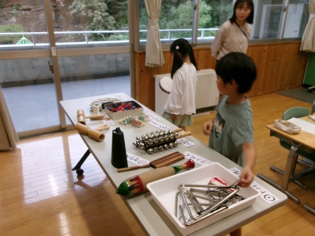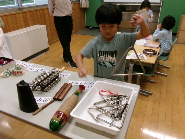トライアングルやすず、タンブリン等の好きな打楽器を選び、「タン」「タタ」「ウン」のリズムを組み合わせて音楽づくりをしました。リズムや楽器によって感じが違っていて、みんなで楽しみながらたくさんの音楽をつくりました。。