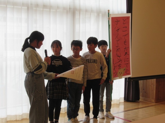 給食時間、ランチルームで、生活安全委員会の子供たちからお知らせがありました。