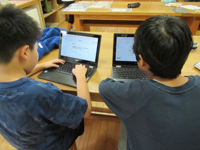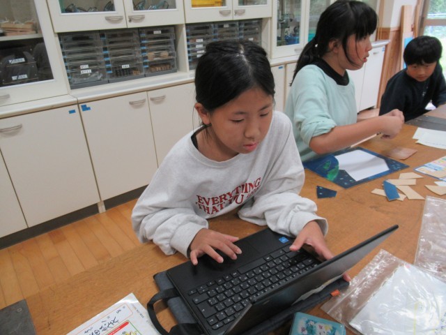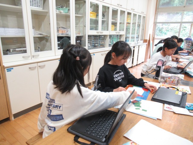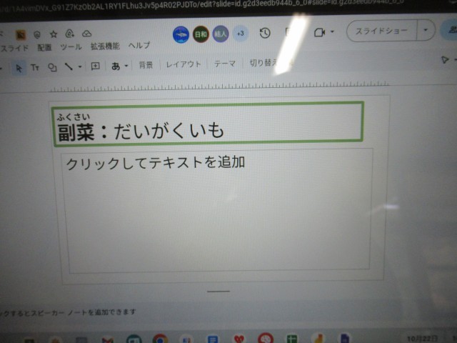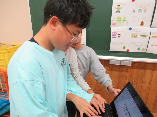 先日、「学校給食やまだの日」のメニューが決定した子供たちは、今度はメニュー紹介のためのスライド作りに取り組んでいました。みんな真剣に、楽しそうに制作していました。