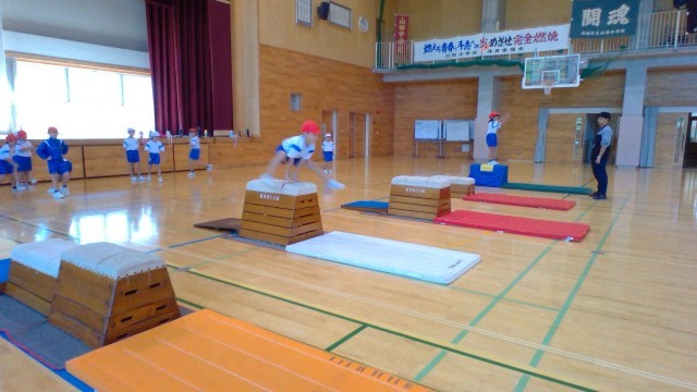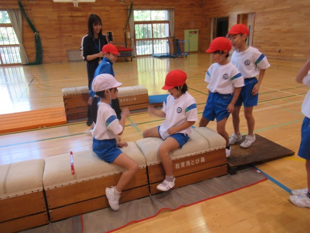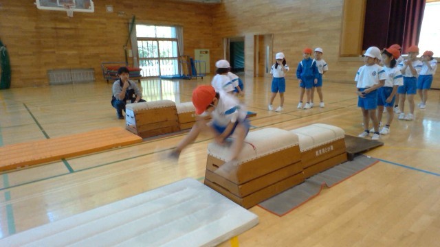 1・2年生は、体育科で「とびばこあそび」に挑戦中です。遊びの中で、手で体を押し出す動きを確認してから、開脚とびに挑戦中です。少しずつ体を押し出すことができるようになってきました。