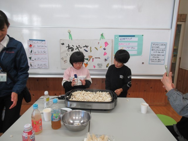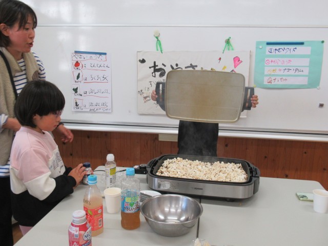 ジャーンッ!おいしそうなポップコーンが出来上がり!塩をたっぷりふりかけ、2人で力を合わせて混ぜ合わせます。おいしいにおいがたまりません!