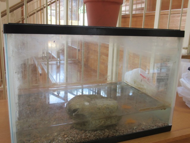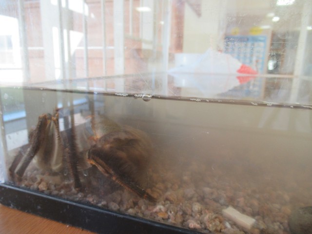 今朝、ある子供から、モクズガニが脱走したらしいという話を聞きました。水槽は結構深かったし、あんなに大きな体ではガラスの側面を這い上がることはなかなか難しいのではと思っていたのですが、未だにモクズガニは戻っていません。どこに行ったのでしょう、うまく外に逃げられていればよいのですが…。クマ対策強化の中、扉は完全に閉まっていますし、水を求めて向かう先は…。