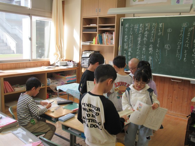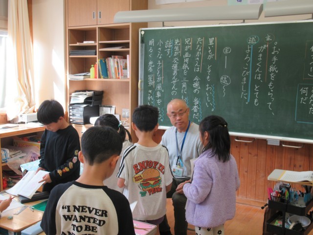 文の構成の基本である「主語」と「述語」について、身近な文章の中から探し出し、線を引いていました。だんだん、見えてくるようになります。文に慣れるには読書が効果的、全国読書週間です、本に親しもう!