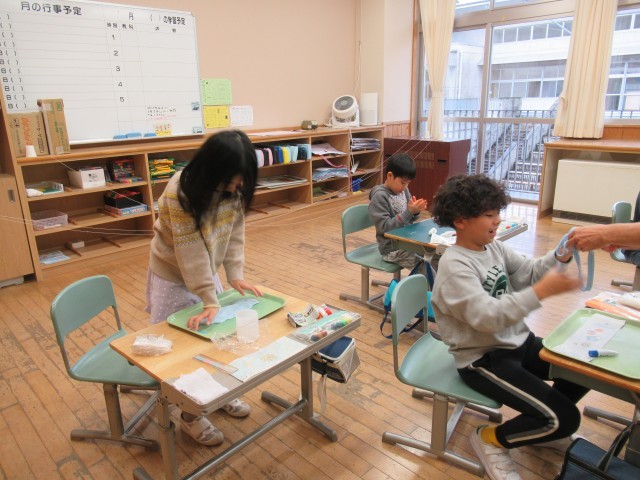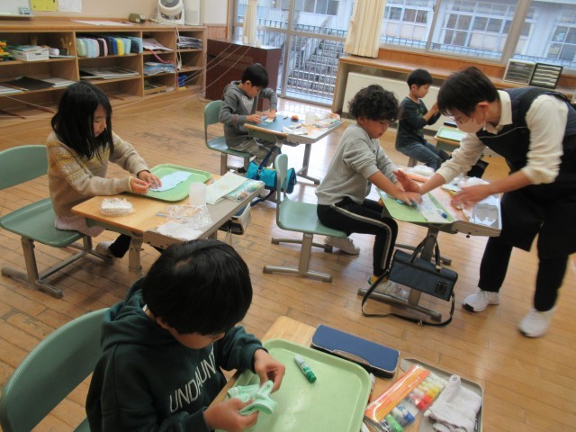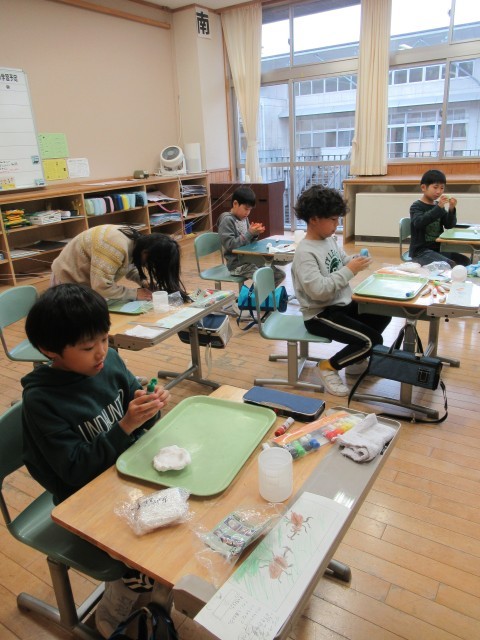 3年生の子供たちは、チューブから好きな色の絵の具を紙粘土の上に出して、こねこね…。伸ばして、こねこね…。丸めてこねこね。白だった紙粘土が、どんどんサーモンピンクや水色、薄緑へと変わっていきます。それが楽しくて。粘土の感触と絵の具の色の伸び具合を楽しみながらこねこねしている子供たちでした。