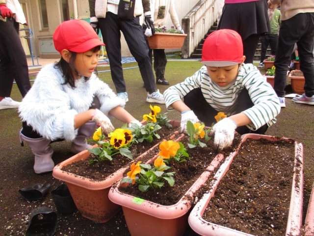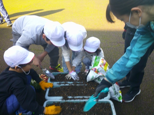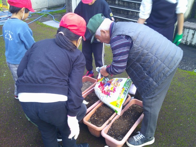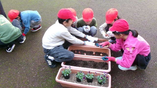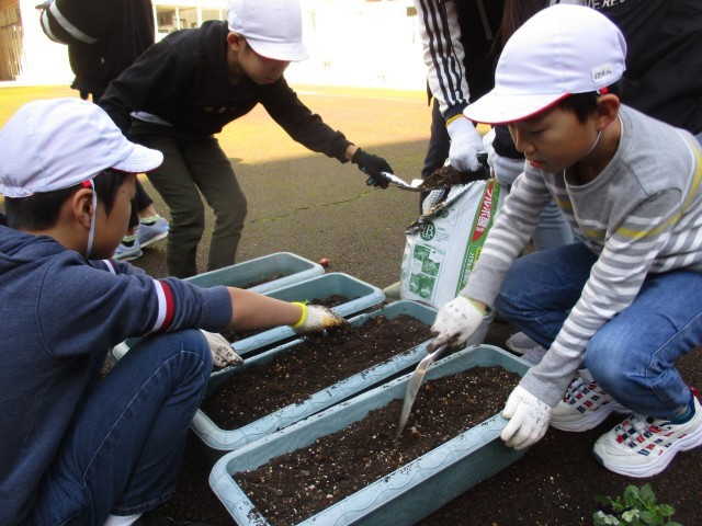 スマイル班でチューリップの球根、ビオラとパンジーの花苗を植えました。学校応援ボランティアの方にも手伝っていただき、各班で協力して球根と花苗を植えていました。春には今回植えたチューリップがたくさん咲くのが楽しみですね。
