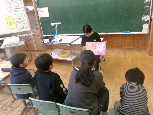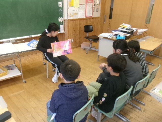 スマイル班で読み聞かせを行いました。班ごとに教室に集まり、読み聞かせをしました。