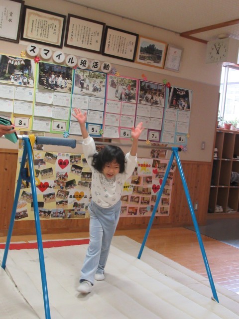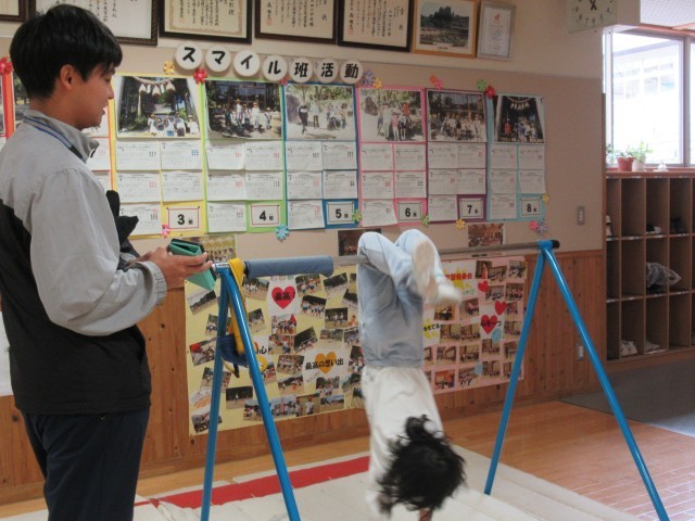 早速鉄棒に行ってみると、既に先生が押さえてくださり、その子は一生懸命練習中、技は「コウモリ振り下り」。軽やかに振り下り、着地が決まりました。明日の得意技紹介に向けて、両手を挙げてのポージングもばっちり決まっていました。