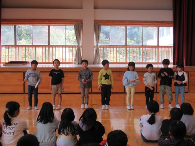 オープニングは、2年生による音の合奏でした。8名の子供たちが、自分の担当楽器を思い思いのリズムで叩いたり鳴らしたりして、楽しむ様子が見られました。