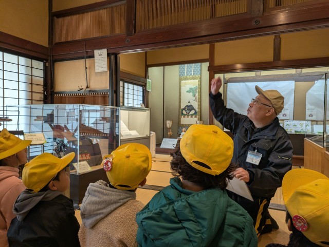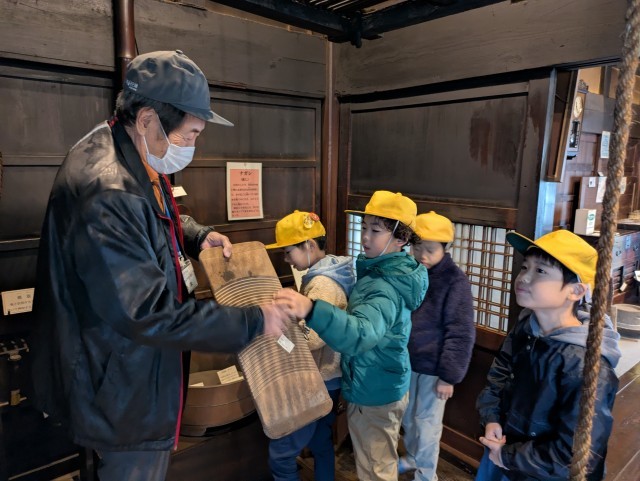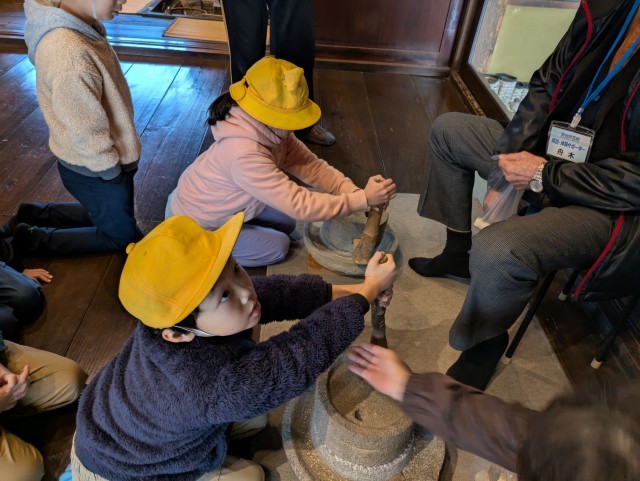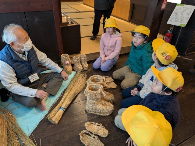 最後に民俗資料館で昔の道具や暮らしについて教えていただき、昔の人々はいろいろな工夫をしながら暮らしていたことを知りました。わらぐつやわらじの作り方を聞き、実際に履いてみたり、石臼で米粉を作ったりと貴重な体験もしました。「昔の人々はよく考えてるね」と新しい発見の多い見学となりました。