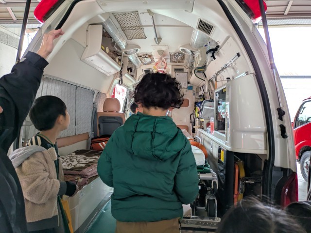 午後からは、富山市消防局に行きました。消防士の方から火事の件数や原因を教えていただいたり、消防車や救急車の中の器具やいろいろな種類の消防車を見ながら説明をしていただいたりしました。最後に、社会の時間に消防の仕事について学習を進めてきた子供たちの質問にも答えていただき、改めて消防の仕事がみんなの安全を守っていることが分かりました。