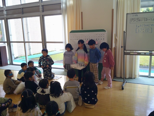 最後には、1年生の生活科で育てたアサガオの種と折り紙をプレゼントしました。感想を聞くコーナーでは、年長さんが「楽しかった」と言ってくれ、とても嬉しそうな1・2年生でした。