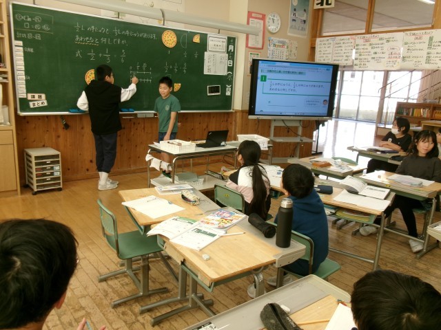 家庭科では、身の回りにある汚れやほこりを見付けました。算数科では、分数のたし算の方法を考え、自分の考えを説明しました。