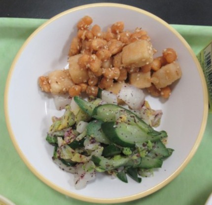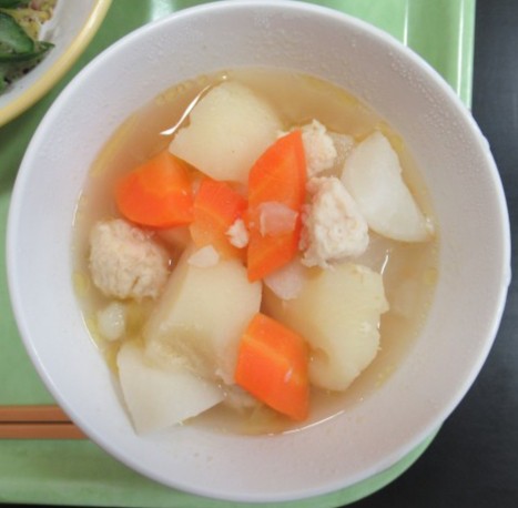 大豆の味噌からめの中に、高野豆腐が入っていて、まるで油揚げのような食感で、味もしみていておいしかったです。冬野菜を代表するカブ、ポトフのスープにカブの味わいと風味がしっかり出ていました。季節を感じるおいしいメニューでした。
