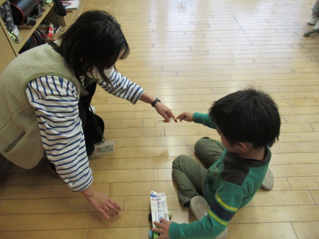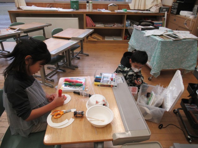 2年生の教室では、子供たちが思い思いのおもちゃづくりに熱心に取り組んでいました。家から牛乳パック、ペットボトル、ペットボトルキャップ、トレー等の生活廃材を用意して、動くおもちゃを制作していました。うまく動くように試行錯誤を重ね、工夫する姿が見られました。
