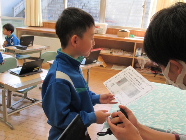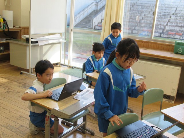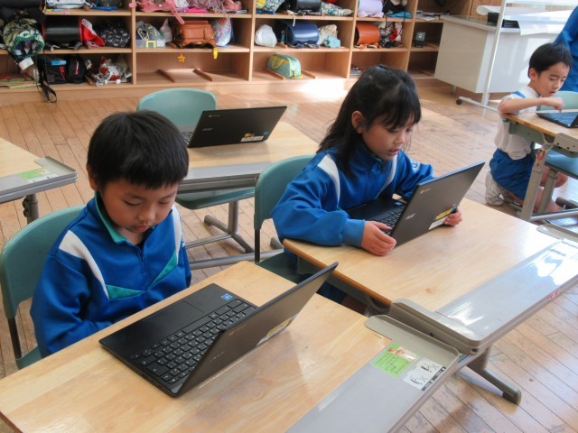 かけ算の学習を終えた2年生は、現在、かけ算九九を習得中。chromebookを開き、ひたすら呪文のように九九を口ずさんでいました。自分でも納得できるくらいになると、いざ担任の元へ…。一生懸命、九九を暗唱していました。合格できたかな?