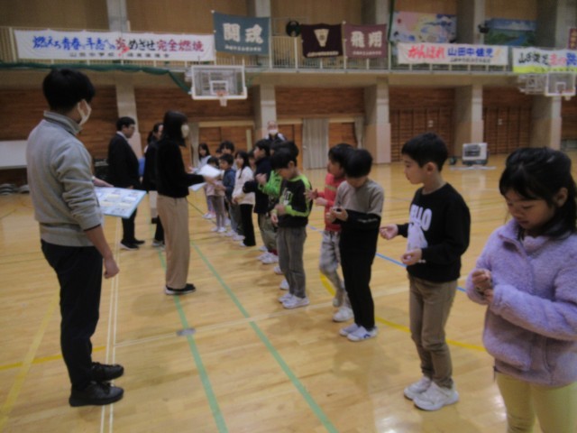 マンドリン部解散コンサートのサプライズとして、4、5年生に花束を渡す子供たちが練習をしていました。4、5年生に気付かれないように、こっそり練習していました。無事に渡せますように…。