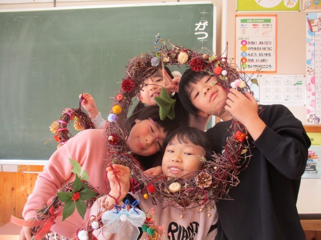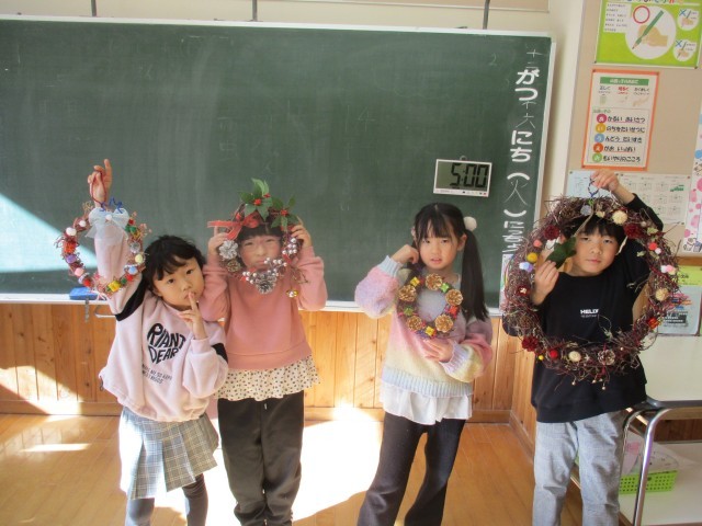 11月につくったあさがおのリース。しばらく教室に飾っていましたが、クリスマスに向けてお家に持ち帰ることにしました。大きなリースの中に4人の顔が入って、「はいチーズ!」