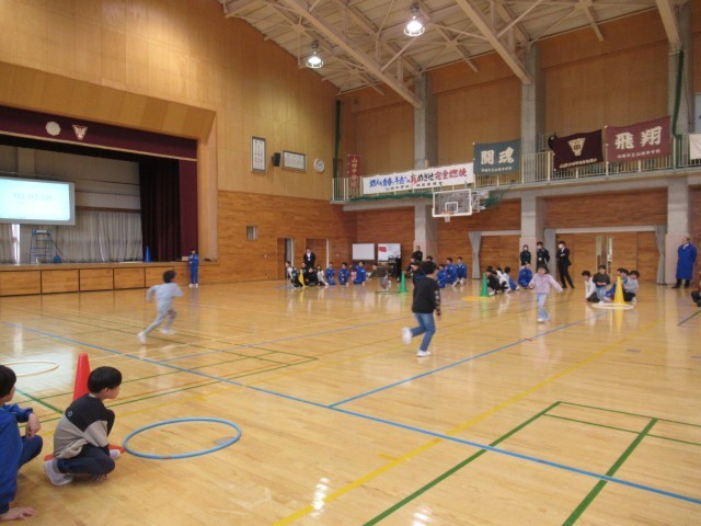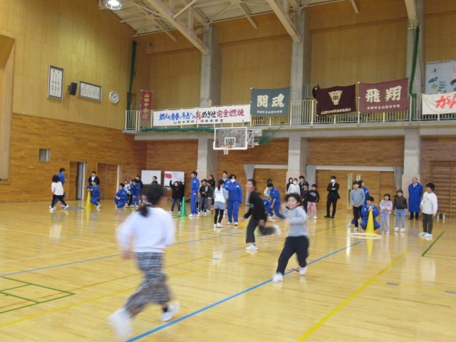 二つ目のゲームは「じゃんけんダッシュ」。ジャンケンをして、フラフープの陣地を目指して走ります。互いにフラフープに入りきられないように次々とジャンケンに出て陣地を守ります。児童生徒を問わず、みんな真剣勝負でした。