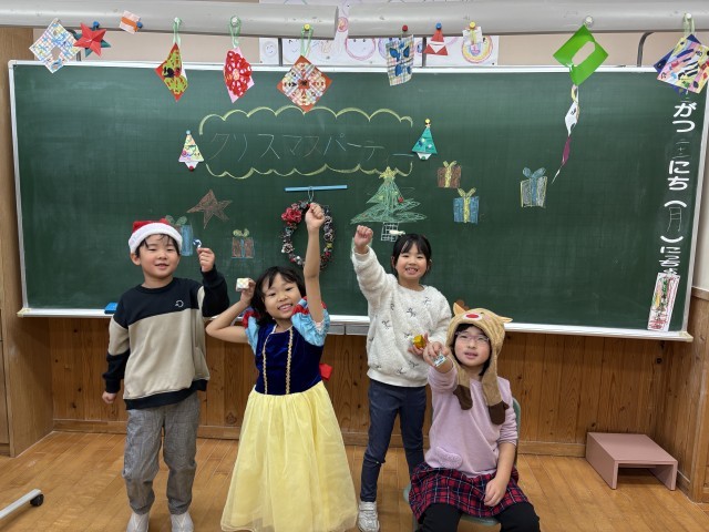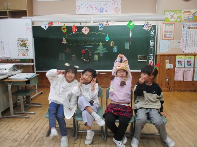 2学期末のお楽しみとしてクリスマスパーティーをしました。教室内を飾ったり、クリスマスらしいものになりきったりしてパーティーがスタートしました。