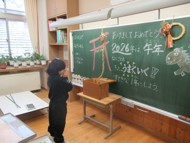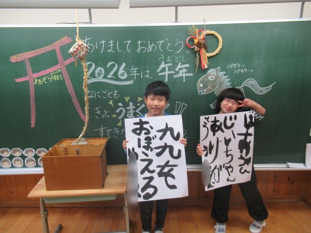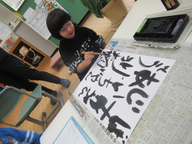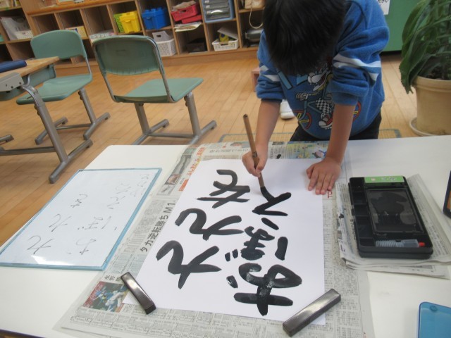 新年のあおぞらタイムは、あおぞら神社への初詣からスタートです。おみくじを引き、1年の抱負を習字で書きました。初めての習字でしたが、力を込めて丁寧に描き上げました。教室に一年間掲示したいと思います。