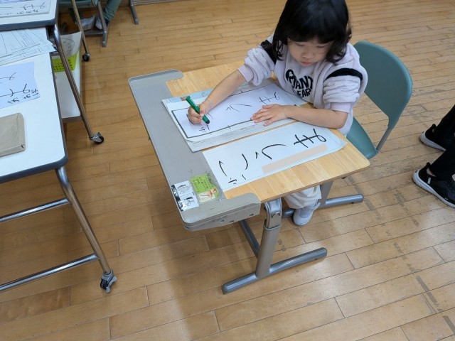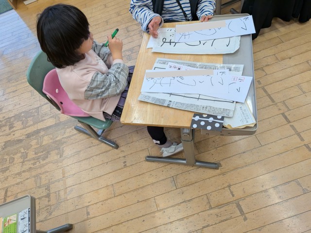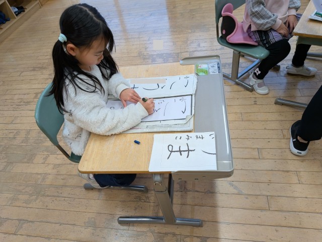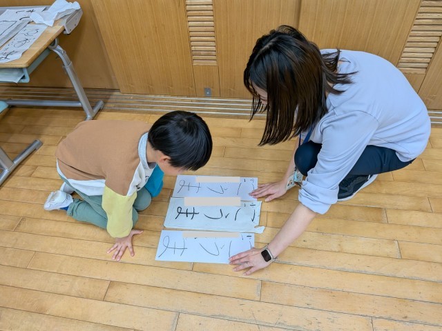 今年の1年生は、「こうま」と書きました。お手本をよく見ながら、一画ずつ丁寧に書いていました。本番で書いた2枚を「こっちは『う』がうまくいったな」、「こっちはバランスよく書けたんだよ」と見比べながら、大会に出す作品を選んでいました。