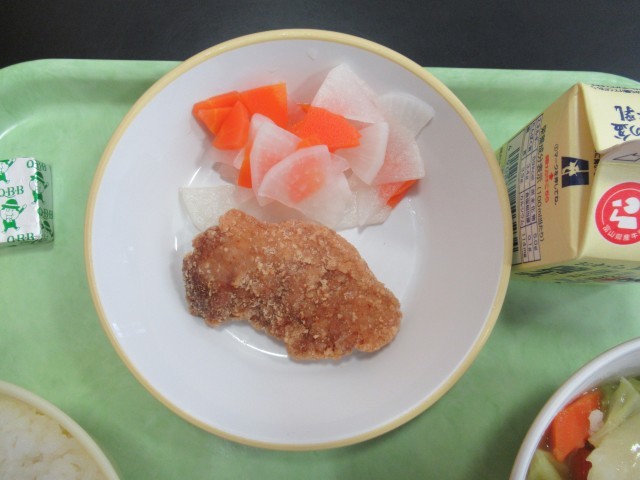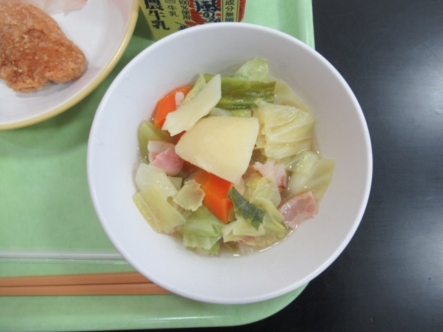 豚肉の香り揚げは、お肉の部位がモモでしたが、とても柔らかくてジューシーでした。きっと調理員さんたちが、愛情込めてお酒等で下味をつけ、おいしくしてくださったからだと思います。野菜のスープ煮も、いろいろな野菜からのうま味、甘味がたっぷりとしみ出し、心身共にあたたまる美味しさでした。