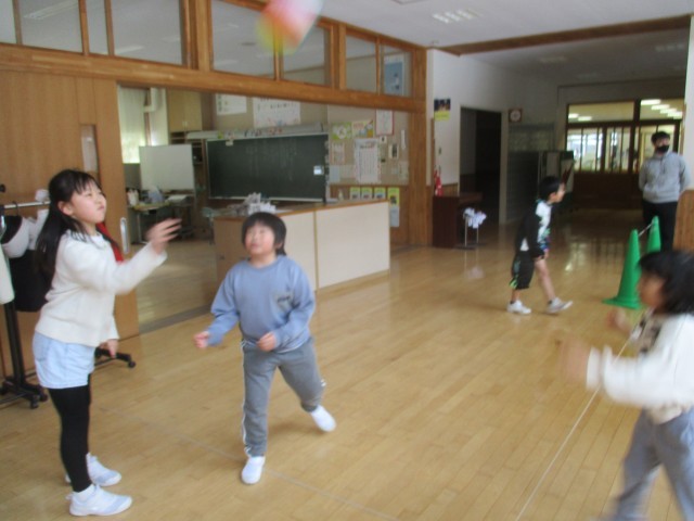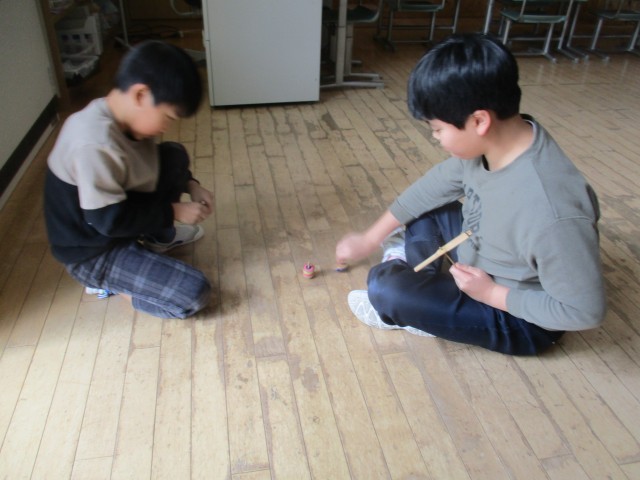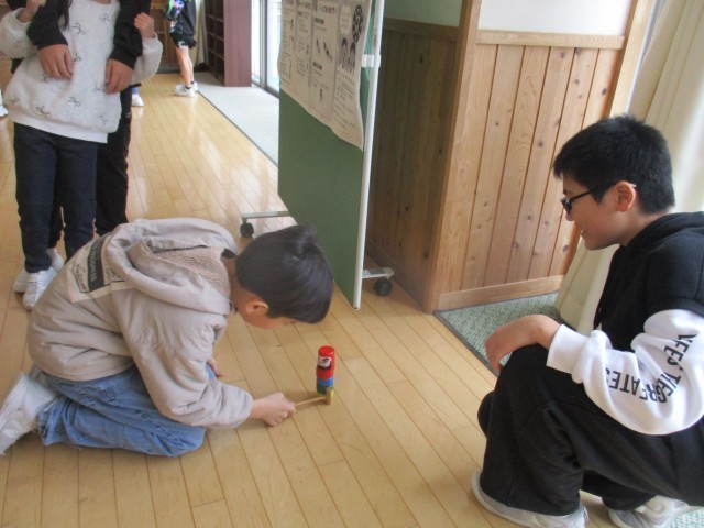 生活科で様々な昔の遊びをしています。1年教室に置いてある遊び道具ですが、休み時間になると他学年もまじって全校で仲良く遊んでいました。皿回し、だるま落とし、紙風船、こま回し等どれも楽しそうです。
