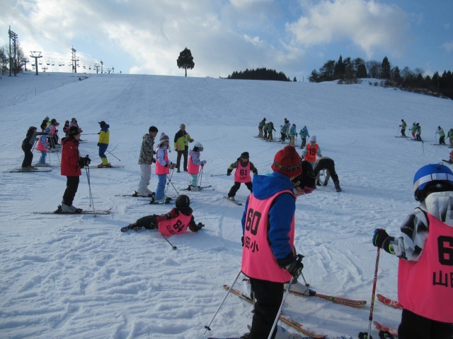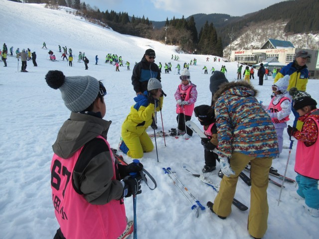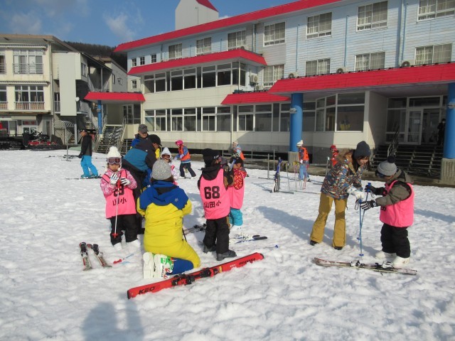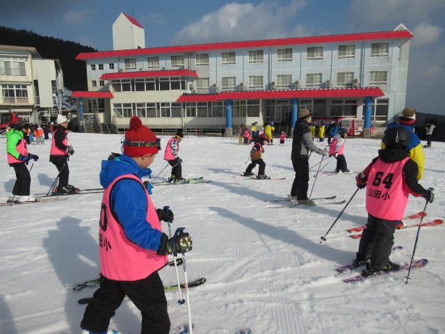 心配していた天気も曇天から光が差し始め、絶好のスキー日和になりました。山田小・中学校の児童生徒は、もってます!各班に分かれ、牛岳スキー学校のスキー指導員の方々の指導の下、いよいよスキー学習が始まりました。