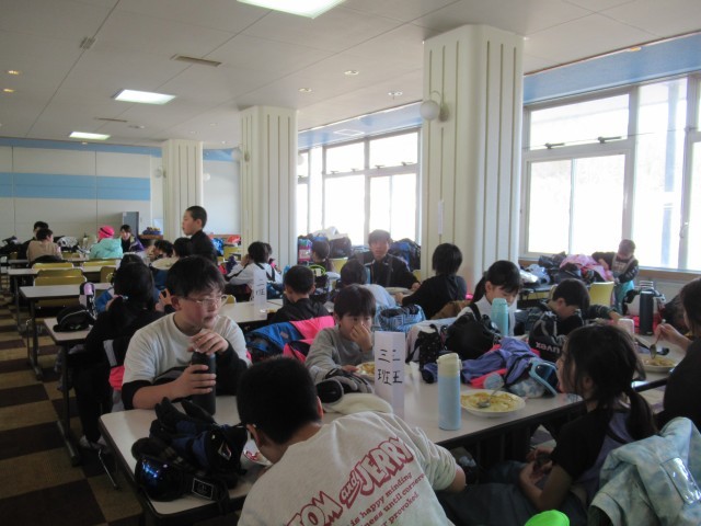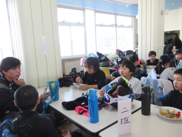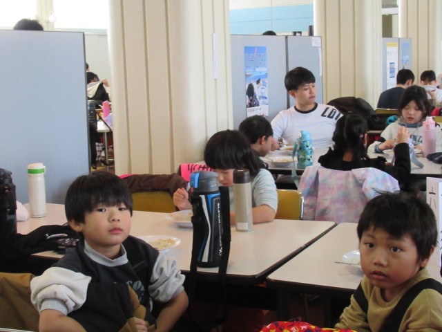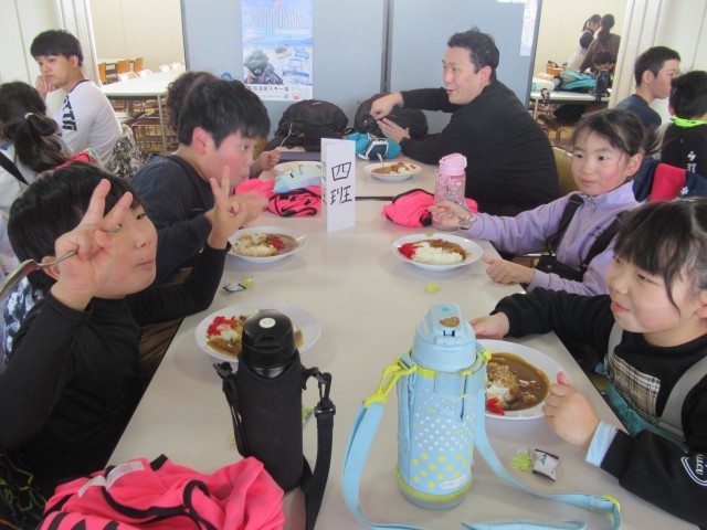 カレーライスを食べる子供たちは元気でした。午前の練習を終えた班から食べるので、もう食べ終えて暇そうな様子の子供たちも…。