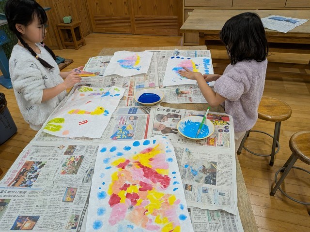 先週刷った版画の周りにスタンプを押しました。自分たちの選んだ生き物に合わせて形や色を考えて押していました。