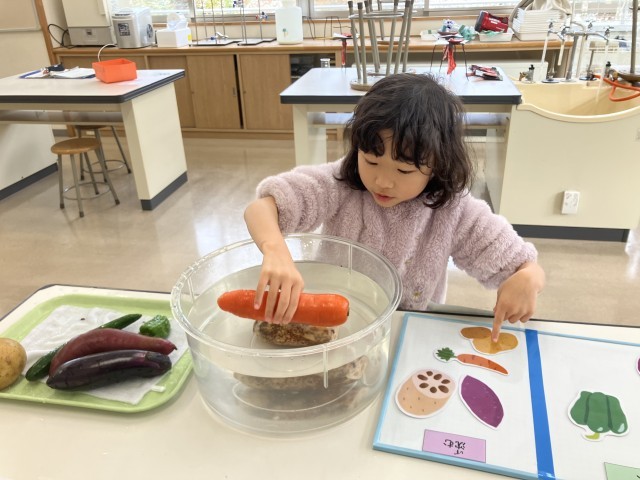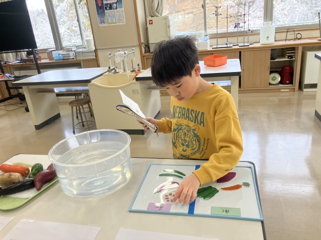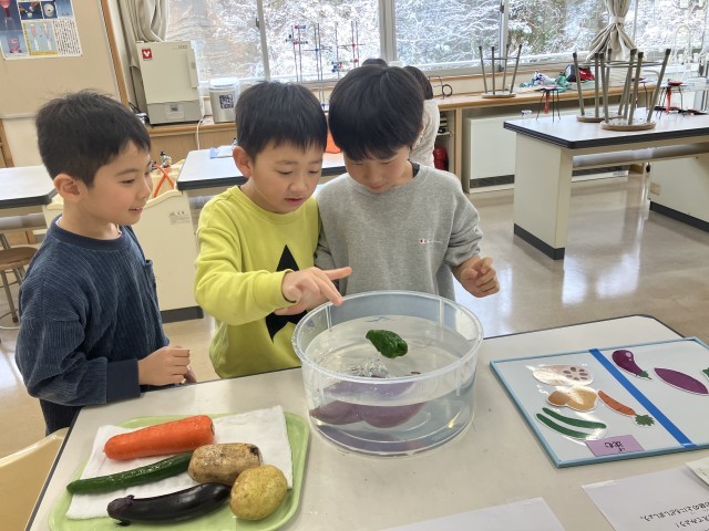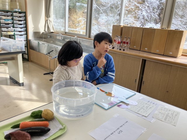 小中合同学校保健委員会のワークショップコーナーの様子です。「水に浮く、浮かない野菜を知ろう」「一食に食べるお米の量を知ろう」「日本全国ご当地給食クイズ」等のコーナーがありました。楽しみながら、食について学ぶことができました。