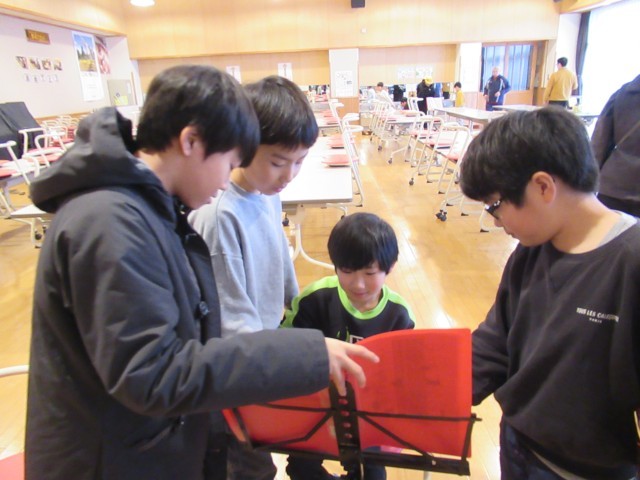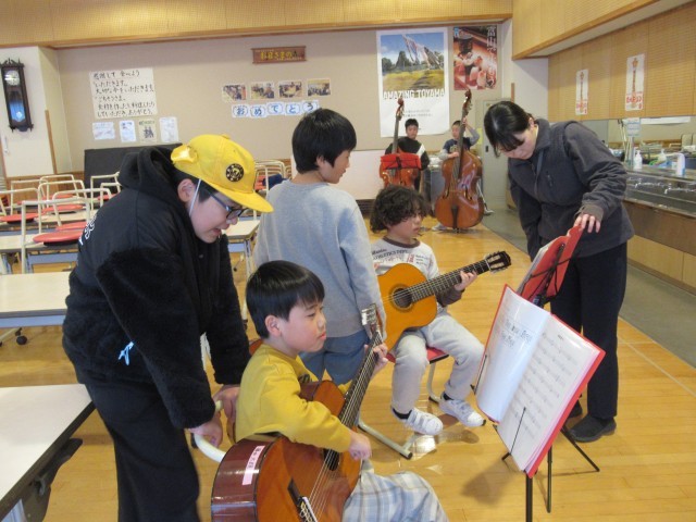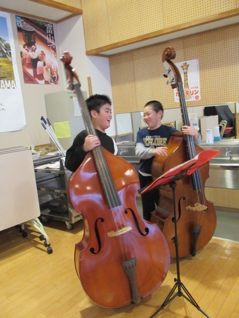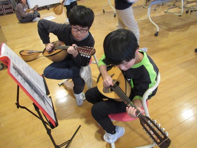 水曜放課後は、3年生を交えてのマンドリン、ギター練習日。卒業生のために、式の入退場で演奏する「威風堂々」を熱心に練習していました。5年生が下級生をリードし、優しく教えている姿が素敵でした。楽器の台数の都合で、コントラバスには新しいメンバー不在です。その分、これまでペアで頑張ってきた二人の息はぴったり!練習中も笑顔が絶えませんでした。