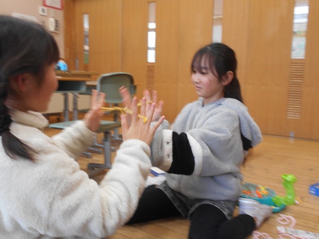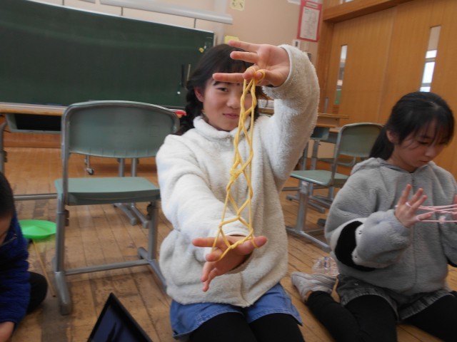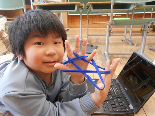 あやとりに親しみました。はじめは難しさを感じていた子供もいましたが、友達に教えてもらったり、何度も挑戦したりする中で、粘り強く紐を操り、形をつくることができました。