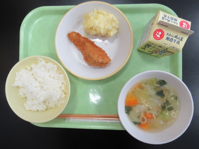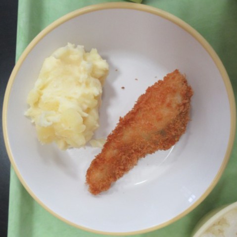 白身魚(タラ)のフライは、外はサクッと中はしっとりと柔らかく、タラの風味を味わいました。アルファベットや数字のマカロニが入ったスープは、いろいろな野菜の出汁が出ていて、熱々でおいしかったです。チーズポテトには、ダイスチーズが入っていて、チーズ感たっぷりの濃厚なマッシュポテトでした。明日も楽しみです。