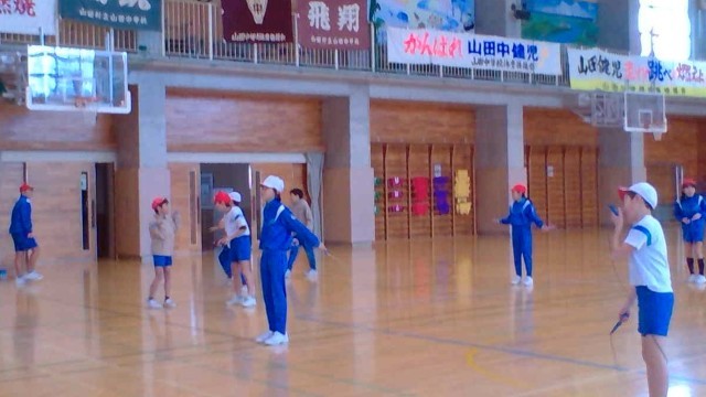 体育の時間には、短縄跳びや大繩の8の字跳びを行っています。雪が降り、外に出づらい時期ですが、子供たちは、縄跳びを使って体力を向上させています。