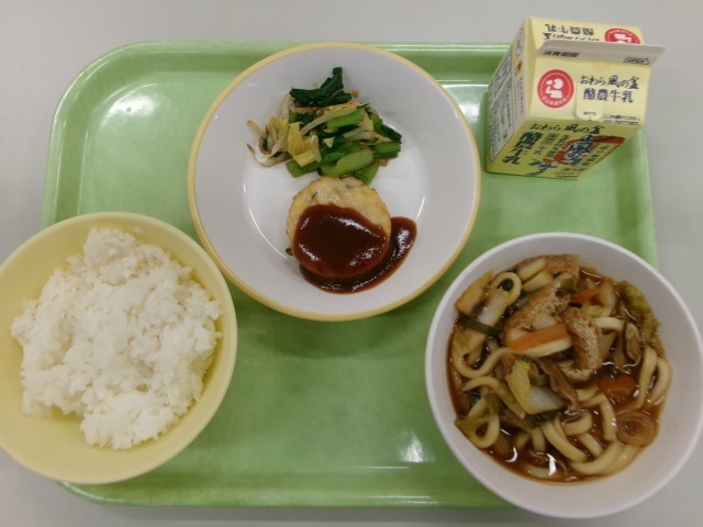 湯葉が給食に登場することは珍しいと思いました。青菜と和えてある湯葉は出汁がしみて、おいしかったです。たっぷり野菜と油揚げを赤味噌で煮込んだうどんで、心身ともにほかほかになりました。