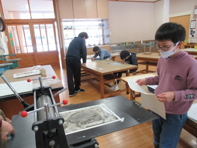 6年生の子供たちは、「思い出の〇〇」と題して、ドライポイントに取り組んでいます。ニードルでプラスチック版に線をひっかき、その線にインクを入れます。線がくっきりと際立ち、インクの付け方や取り方によって背景の雰囲気が変わってきます。一人一人の大切な思い出を版にしていました。仕上がりが楽しみです。